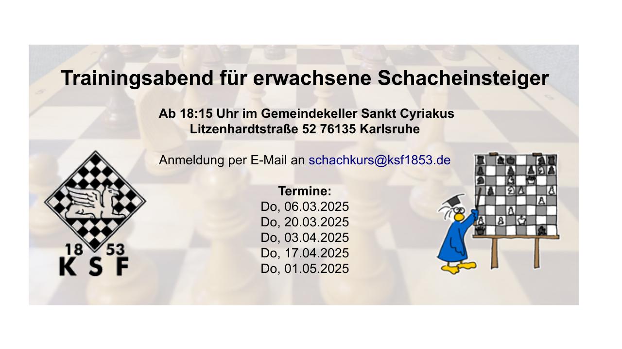 Home Nachrichten Stellenausschreibung – Bundesfreiwilligendienst im Schach ab 01.12.2025 Von Zugchaos bis Werwölfe – eine verrückte Freizeit in Freudenstadt Alan spiel Schach in Peking Unsere Schachkurse Schnuppertraining für Kinder und JugendlicheTrainingsabend für erwachsene Schacheinsteiger Schachabend für Frauen Mannschaften Pokalmannschaft scheidet früh ausKSF II zerlegen den TabellenführerOberliga Baden-Württemberg an diesem WochenendeViele Chancen und nur ein Brettsieg für KSF 5Knappe Niederlage für KSF 5 gegen Bruchsal 2Oberliga Runde 2 Jugend Sieg gegen Göppingen in der Jugendbundesliga SüdGelungener Auftakt: 20 Kinder beim ersten Sonntagsturnier der neuen SaisonSchnuppertraining für Kinder und JugendlicheLichess Sommerferien-ChallengeStellenausschreibung – Bundesfreiwilligendienst im Schach ab 01.12.2025Sieg in der JugendbundesligaVon Zugchaos bis Werwölfe – eine verrückte Freizeit in FreudenstadtAlan spiel Schach in PekingEhrung unserer Schachtalente bei der Jugendsportehrung der Stadt KarlsruheSpiel, Spaß und Schach – BW-Sommercamp 20252.Runde Jugendbundesliga: Leider nicht erfolgreichZwei mal Gold und zwei Mal Silber bei der Bezirksmannschaftsmeisterschaft Vereinsabend Offene Vereinsmeisterschaft gestartetSaisoneröffnungsblitzturnierKSF-SommerblitzturniereSaisonabschlussblitzturnierKSF-Vereinsmeisterschaft 24/25 Spielbetrieb 13. Offene Baden-Württembergische Familienmeisterschaft – das etwas andere Turnier19. Internationales Deizisauer Herbstopen 2025Badische Einzelmeisterschaft in Ettlingen – Lukas Pfatteicher wird Vizemeister!Heuchelberg-Cup 2025Lucas beim Standard-Open in Rheinfelden Mädchen- und Frauenschach Viele Chancen und nur ein Brettsieg für KSF 5Knappe Niederlage für KSF 5 gegen Bruchsal 2Schachabend für FrauenKSF 6 gewinnt Bruderduell gegen KSF 5 in der ersten Runde der BezirksklasseStarker Auftakt in der 2.Frauenbundesliga Senioren Senioren-Bezirksmannschaftsmeisterschaft – Zweiter Sieg für das KSF-TeamSenioren-Bezirksmannschaftsmeisterschaft – Saison 2022/23: Das KSF-Team ist wieder dabeiSeniorenteam holt badischen Titel!Wieder einmal Endstation EppingenSeniorenkampf endet 4:0 für die „Gastgeber“ aus Karlsruhe Allgemein Sieg gegen Göppingen in der Jugendbundesliga Süd2. Doppelrunde der 2. FBL SüdOberliga Rd.3Kurzbericht von der Bezirksversammlung 2025Kurzbericht vom Verbandstag 2025 in Baden-Baden