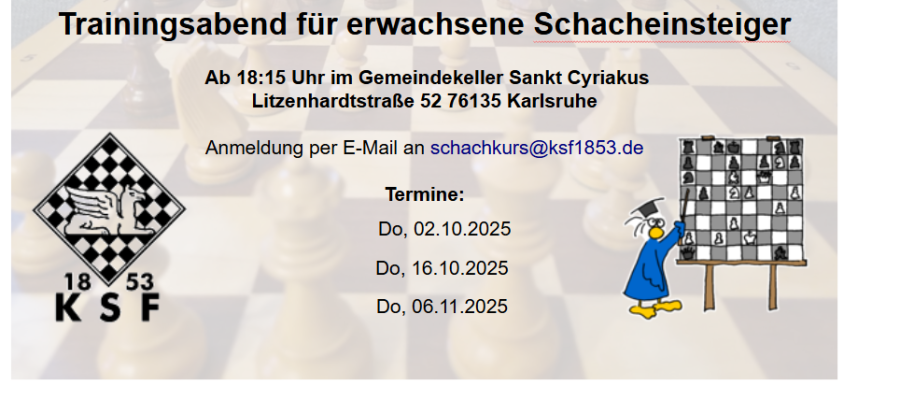 Für mehr Informationen und zur Anmeldung kann man sich per E-Mail an schachkurs@ksf1853.de wenden.