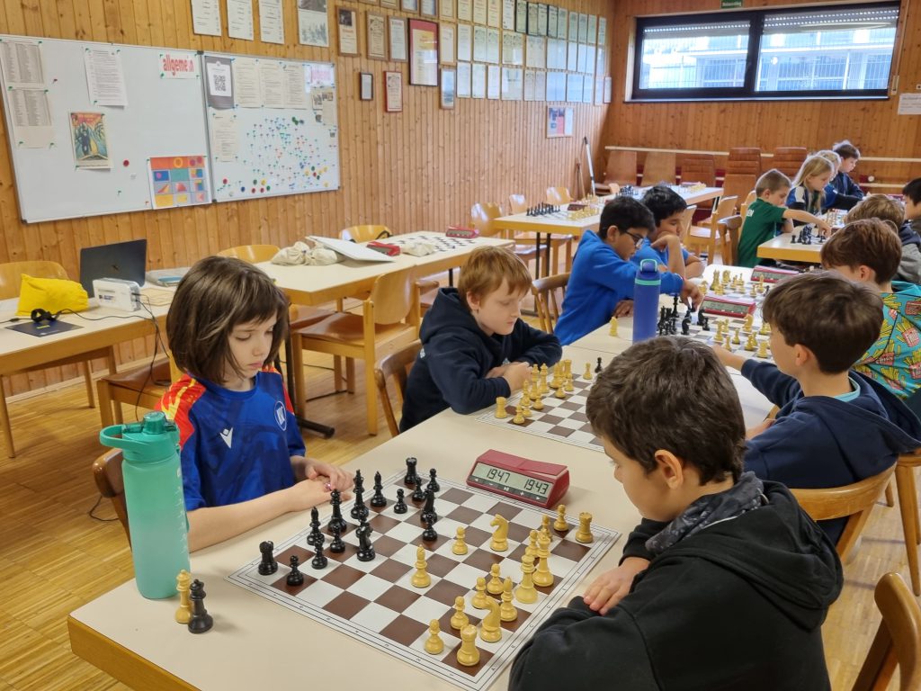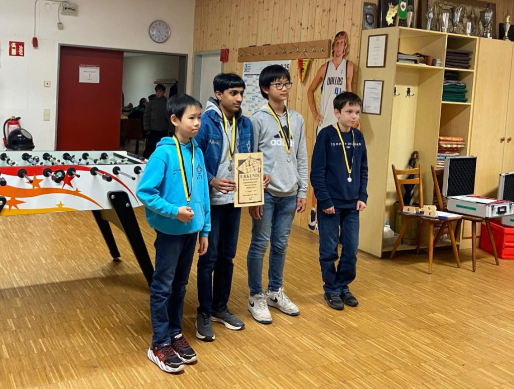 Unsere erste U14-Mannschaft mit Christopher, Felix, Advay und Ben H. schlug sich in dem gemischten Feld sehr beachtlich. Christopher spielte gegen Jakob (KSF 1 U16) Remis und gewann alle anderen Partien. Advay steuerte 5 Punkte bei, Ben 3 Punkte, und Felix am zweiten Brett 2 Punkte. Mit 8 Mannschaftspunkten belegte das Team einen sehr guten 3. Platz im Gesamtturnier.