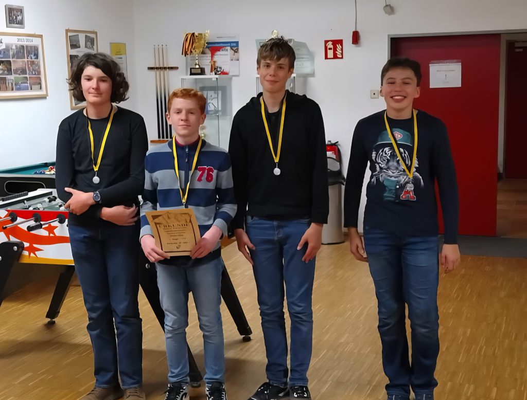 Unser erstes U16-Team – bestehend aus Jakob, Maximilian M., Janis und Kalle – spielte ein nahezu perfektes Turnier. Mit 25,5 von 28 möglichen Brettpunkten und 14:0 Mannschaftspunkten sicherte sich das Quartett souverän den Turniersieg. Besonders herausragend war Maxi, der mit 7 Siegen aus 7 Partien eine makellose Bilanz vorweisen konnte.