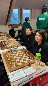 Der nächste Gegner hieß Gräfeling. Sicherlich keine einfache Aufgabe, aber die Jungs waren hochmotiviert. Zunächst kamen alle relativ gut aus der Eröffnung raus. Janis hatte bald wieder einen Vorteil erspielt. Kalle hat auch leichten Vorteil. Bei Maxi und Jakob war es schwer einzuschätzen. Nach knapp 160min kam Jakob freudestrahlend zu uns Betreuern ins Zimmer, er hatte gewonnen. Da zu diesem Zeitpunkt Janis deutlich auf Siegeskurs war und Maxi’s Partie nach einem eindeutigen Remis aussah, freuten wir uns schon auf einen Sieg der Mannschaft. Dann kam aber 10 Minuten später Maxi geknickt ins Zimmer, er hatte die Partie eingestellt und verloren. Damit wurde die Partie von Kalle spielentscheidend. Ein Remis von ihm würde uns für einen Mannschaftssieg genügen. Jedoch spielte Kalle etwas zu zurückhaltend und ließ seinen Gegner mit den Bauern auf dem Königsflügel vorrücken. Das kostete ihn schließlich eine Qualität. Nun begann ein längerer Krimi mit viel auf und ab. Der gegnerische Läufer war ziemlich eingeschränkt und Kalle konnte den Vorstoß seines Gegners abwehren und sich auch in die Bonuszeit retten. Inzwischen waren bereits mehr als 4 Stunden Spielzeit vergangen und die Küche würde bald schließen. Daher stellten wir Betreuer für Kalle einen Teller mit Essen beiseite während die Jungs an der Seitenlinie im Turnierzimmer mitfieberten. Denn Kalle hatte es durch Hartnäckigkeit tatsächlich geschafft, die Situation umzudrehen und nun stand er besser als sein Gegner da. Da war er wieder, der Hoffnungsfunke auf einen Mannschaftssieg. Doch nach knapp 5 Stunden Spielzeit ließ dann doch die Konzentration nach – und die Uhr war inzwischen wieder mehrfach nahe der Null gekommen – so dass sich Kalle letztendlich doch Matt geschlagen geben musste. Die Enttäuschung nach diesem langen Kampf war ihm deutlich anzusehen und alle fühlten mit ihm mit.