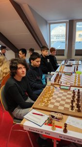 Der nächste Gegner hieß Gräfeling. Sicherlich keine einfache Aufgabe, aber die Jungs waren hochmotiviert. Zunächst kamen alle relativ gut aus der Eröffnung raus. Janis hatte bald wieder einen Vorteil erspielt. Kalle hat auch leichten Vorteil. Bei Maxi und Jakob war es schwer einzuschätzen. Nach knapp 160min kam Jakob freudestrahlend zu uns Betreuern ins Zimmer, er hatte gewonnen. Da zu diesem Zeitpunkt Janis deutlich auf Siegeskurs war und Maxi’s Partie nach einem eindeutigen Remis aussah, freuten wir uns schon auf einen Sieg der Mannschaft. Dann kam aber 10 Minuten später Maxi geknickt ins Zimmer, er hatte die Partie eingestellt und verloren. Damit wurde die Partie von Kalle spielentscheidend. Ein Remis von ihm würde uns für einen Mannschaftssieg genügen. Jedoch spielte Kalle etwas zu zurückhaltend und ließ seinen Gegner mit den Bauern auf dem Königsflügel vorrücken. Das kostete ihn schließlich eine Qualität. Nun begann ein längerer Krimi mit viel auf und ab. Der gegnerische Läufer war ziemlich eingeschränkt und Kalle konnte den Vorstoß seines Gegners abwehren und sich auch in die Bonuszeit retten. Inzwischen waren bereits mehr als 4 Stunden Spielzeit vergangen und die Küche würde bald schließen. Daher stellten wir Betreuer für Kalle einen Teller mit Essen beiseite während die Jungs an der Seitenlinie im Turnierzimmer mitfieberten. Denn Kalle hatte es durch Hartnäckigkeit tatsächlich geschafft, die Situation umzudrehen und nun stand er besser als sein Gegner da. Da war er wieder, der Hoffnungsfunke auf einen Mannschaftssieg. Doch nach knapp 5 Stunden Spielzeit ließ dann doch die Konzentration nach – und die Uhr war inzwischen wieder mehrfach nahe der Null gekommen – so dass sich Kalle letztendlich doch Matt geschlagen geben musste. Die Enttäuschung nach diesem langen Kampf war ihm deutlich anzusehen und alle fühlten mit ihm mit.