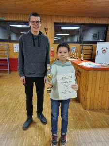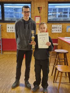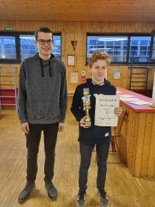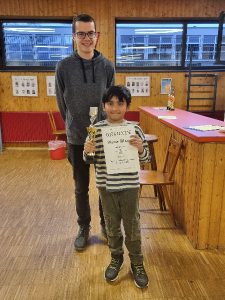 Die U10 spielte mit der U12 in einem Turnier zusammen, wurde aber einzeln gewertet. Hier wurde Noah Kissel (linkes Bild) auf Platz 2 Bezirksmeister in der U10 und Dhyaan Valavoor – als Gesamtsieger des Turniers – Bezirksmeister der U12.