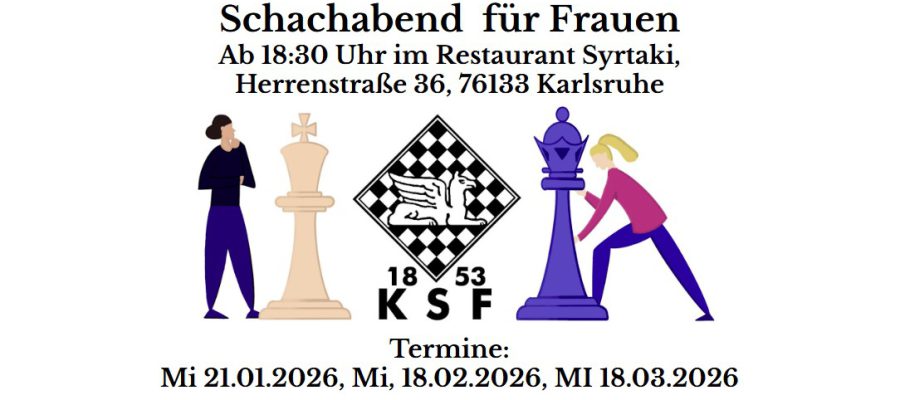 Am dritten Mittwoch im Monat haben wir einen Schachabend für Frauen etabliert. Wir treffen uns dazu ab 18:30 Uhr im Restaurant Syrtaki in der Herrenstraße 36. Es ist auch möglich, zu einer späteren Uhrzeit dazu zu stoßen. Frauen jedes Spielniveaus sind herzlich zum Mitspielen eingeladen. Kein Mitgliedsbeitrag, keine Teilnahmegebühr. Einfach vorbeischauen und Frauenpower mitbringen!