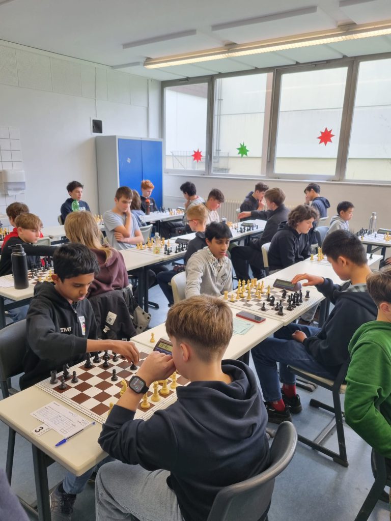 Auch in der WK 4 waren wir stark vertreten. Das Fichte-Gymnasium trat mit Dhyaan Valavoor, Romain Fritsch, Felix Kauth und Linus Kato (vereinslos= an. Für das Bismarck-Gymnasium spielten Ben Je und Jaemu Park, unterstützt von Jiahao Zhang (SK Ettlingen) sowie Matteo Lembcke (vereinslos). Das Bismarck-Team legte einen Traumstart hin und gewann die ersten fünf Runden. Beim Fichte verlief der Auftakt holpriger: Ein 2:2 gegen das Carl-Friedrich-Gauß-Gymnasium Hockenheim und eine 1:3-Niederlage gegen die St. Raphael Schule Heidelberg sorgten für Spannung. Doch danach war das Team „warmgespielt“ und gewann alle restlichen Matches – darunter ein überzeugendes 4:0 gegen das Bismarck-Gymnasium, gegen das es im Bezirksfinale noch 2:2 gestanden hatte. Am Ende sicherte sich das Bismarck-Gymnasium mit 12:2 Mannschaftspunkten und 22:6 Brettpunkten den 1. Platz, knapp vor dem Fichte-Gymnasium (11:3 MP, 21,5:6,5 BP). Die Einzelleistungen waren ein wesentlicher Erfolgsfaktor: Ben erzielte starke 5,5 Punkte, Jaemu kam auf 4,5 Punkte. Dhyaan überzeugte an Brett 1 mit 5 Punkten, während Romain und Felix jeweils hervorragende 6 aus 7 Partien erreichten. Für einen besonderen Moment sorgte Betreuer Jakob mit einem augenzwinkernden Motivationstipp an Felix: Die Hände im KSF-Pulli „verstecken“, bis der beste Zug gefunden ist. Der Erfolg scheint ihm recht zu geben.