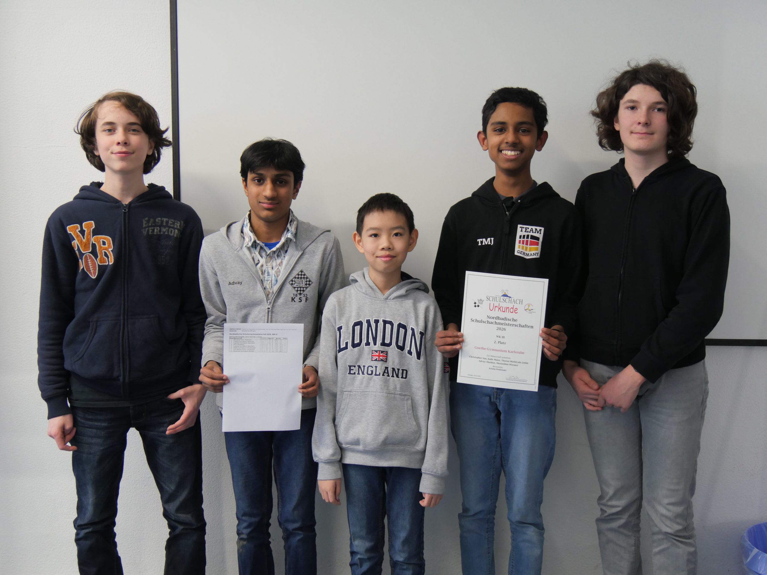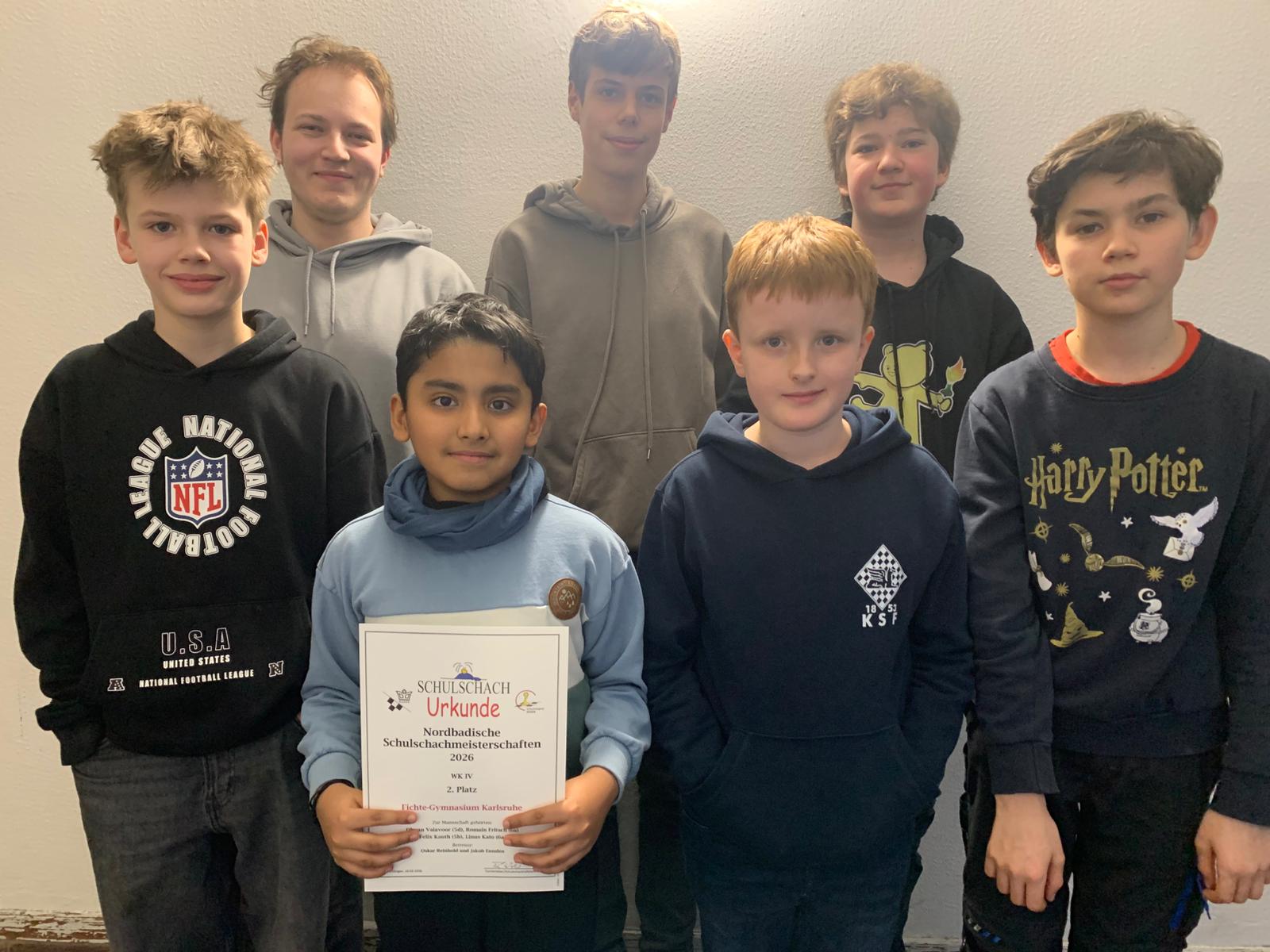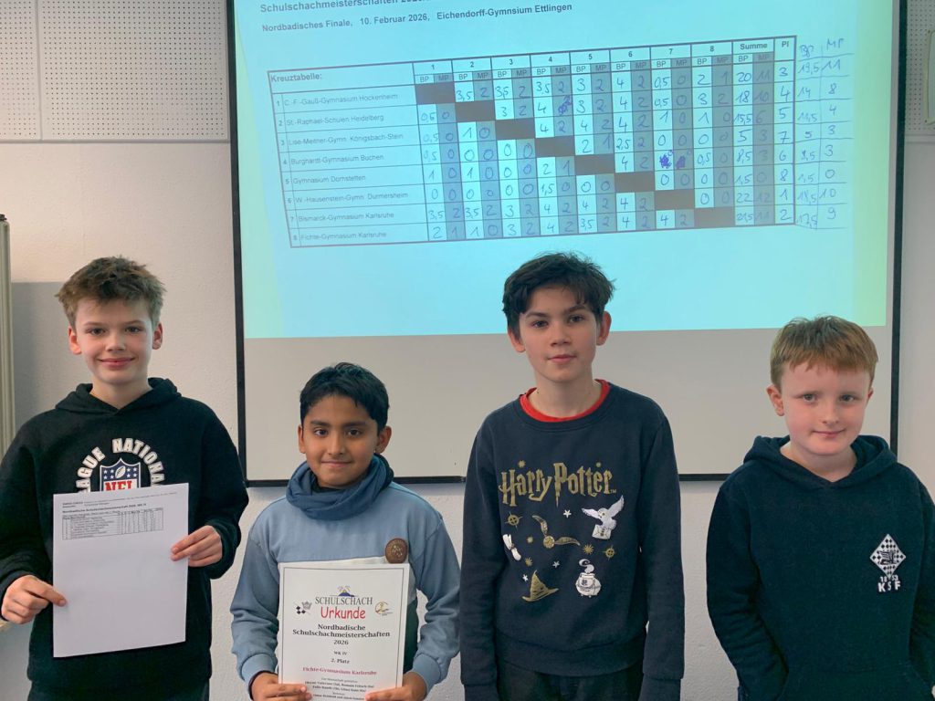 Auch in der WK 4 waren wir stark vertreten. Das Fichte-Gymnasium trat mit Dhyaan Valavoor, Romain Fritsch, Felix Kauth und Linus Kato (vereinslos= an. Für das Bismarck-Gymnasium spielten Ben Je und Jaemu Park, unterstützt von Jiahao Zhang (SK Ettlingen) sowie Matteo Lembcke (vereinslos). Das Bismarck-Team legte einen Traumstart hin und gewann die ersten fünf Runden. Beim Fichte verlief der Auftakt holpriger: Ein 2:2 gegen das Carl-Friedrich-Gauß-Gymnasium Hockenheim und eine 1:3-Niederlage gegen die St. Raphael Schule Heidelberg sorgten für Spannung. Doch danach war das Team „warmgespielt“ und gewann alle restlichen Matches – darunter ein überzeugendes 4:0 gegen das Bismarck-Gymnasium, gegen das es im Bezirksfinale noch 2:2 gestanden hatte. Am Ende sicherte sich das Bismarck-Gymnasium mit 12:2 Mannschaftspunkten und 22:6 Brettpunkten den 1. Platz, knapp vor dem Fichte-Gymnasium (11:3 MP, 21,5:6,5 BP). Die Einzelleistungen waren ein wesentlicher Erfolgsfaktor: Ben erzielte starke 5,5 Punkte, Jaemu kam auf 4,5 Punkte. Dhyaan überzeugte an Brett 1 mit 5 Punkten, während Romain und Felix jeweils hervorragende 6 aus 7 Partien erreichten. Für einen besonderen Moment sorgte Betreuer Jakob mit einem augenzwinkernden Motivationstipp an Felix: Die Hände im KSF-Pulli „verstecken“, bis der beste Zug gefunden ist. Der Erfolg scheint ihm recht zu geben.