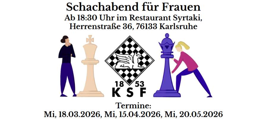 Am dritten Mittwoch im Monat haben wir einen Schachabend für Frauen etabliert. Wir treffen uns dazu ab 18:30 Uhr im Restaurant Syrtaki in der Herrenstraße 36. Es ist auch möglich, zu einer späteren Uhrzeit dazu zu stoßen. Frauen jedes Spielniveaus sind herzlich zum Mitspielen eingeladen. Kein Mitgliedsbeitrag, keine Teilnahmegebühr. Einfach vorbeischauen und Frauenpower mitbringen!