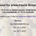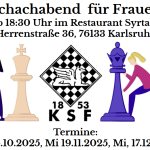 Schachkurse Schachkurse Trainingsabend für erwachsene SchacheinsteigerSchachabend für FrauenKleine Könige spielen Schach – der Zwergenschachkurs 2025Meldet eurer Kind für den Zwergenschachkurs 2025 an!Zwergenschachkurs für Kinder ab 4 JahrenFaszination Schach 25.-28.03. in der Postgalerie KarlsruheFerienschachkurs im SommerSchachkurse in den SommerferienZwergenschachkurs für Kinder ab 4 JahrenSchach Schnupperkurs für Kinder ab 7 Jahren startet am Montag 30. Januar