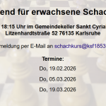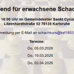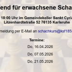 Schachkurse Schachkurse Schachabend für FrauenTrainingsabend für erwachsene SchacheinsteigerSchnuppertraining für Kinder und JugendlicheKleine Könige spielen Schach – der Zwergenschachkurs 2025Meldet eurer Kind für den Zwergenschachkurs 2025 an!Zwergenschachkurs für Kinder ab 4 JahrenFaszination Schach 25.-28.03. in der Postgalerie KarlsruheFerienschachkurs im SommerSchachkurse in den SommerferienZwergenschachkurs für Kinder ab 4 Jahren
